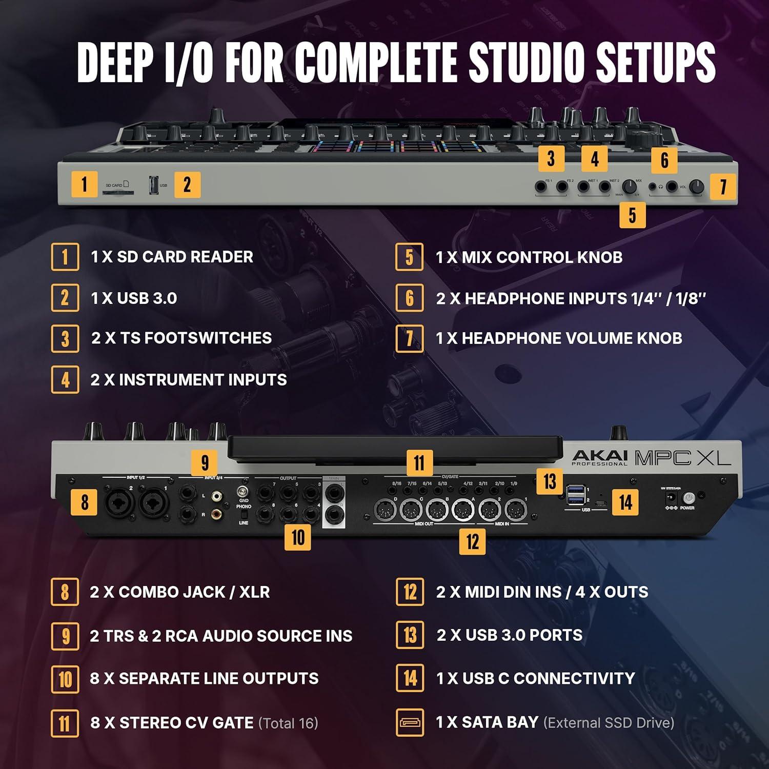 This performance-first production hub has everything you need for pro-level music making. It features ultra-responsive MPCe pads, a dedicated step sequencer with 16 function modes, 16 touch-responsive Q-Links with OLED displays, a next-gen 8-core processor, 16 GB RAM, hands-on performance touch-strip, and one-to-one surface control buttons. MPC XL is equipped with advanced sequencing, clip launching, pro stem separation, high-quality time-stretching, and powerful I/O connectivity.